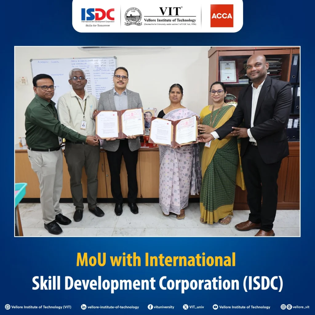 Vellore Institute of Technology (VIT), Vellore, signed a Memorandum of Understanding (MoU) with the International Skill Development Corporation (ISDC–Global) and ACCA (Association of Chartered Certified Accountants) on 29 January 2026.