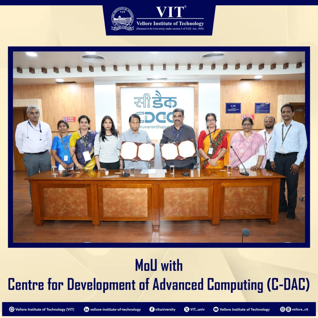 VIT has signed a Memorandum of Understanding (MoU) with the Centre for Development of Advanced Computing (C-DAC), Thiruvananthapuram.